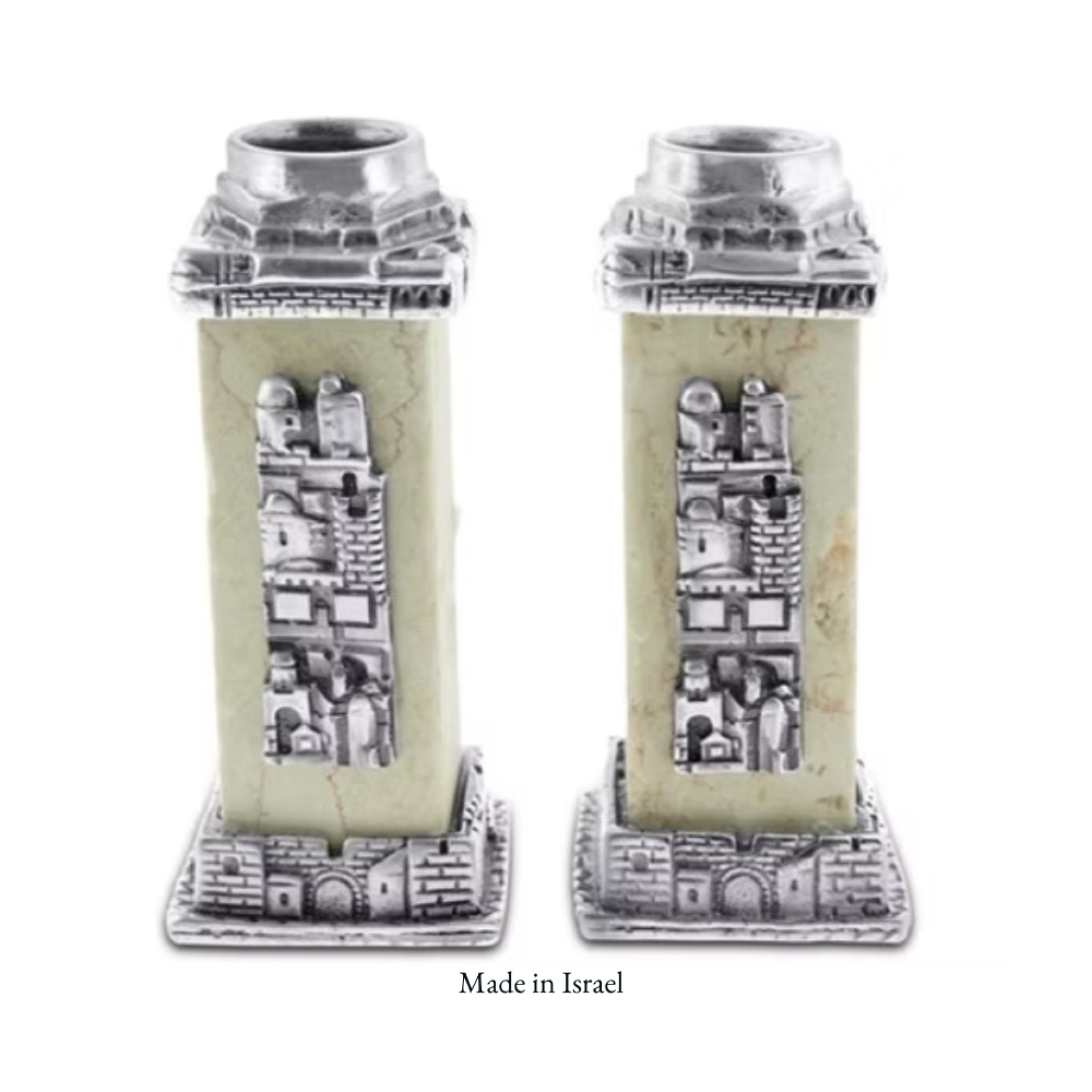 These elegant Shabbat candleholders are hand carved from Jerusalem stone (dolomitic limestone) and embellished with a Jerusalem scene in cast metal with an antique silver finish. They are uniquely made in the Holy Land by Jewish immigrants and are designed to hold taper candles. Imagine lighting the candles with these beautiful candle holders! A great addition to your Shabbat table.