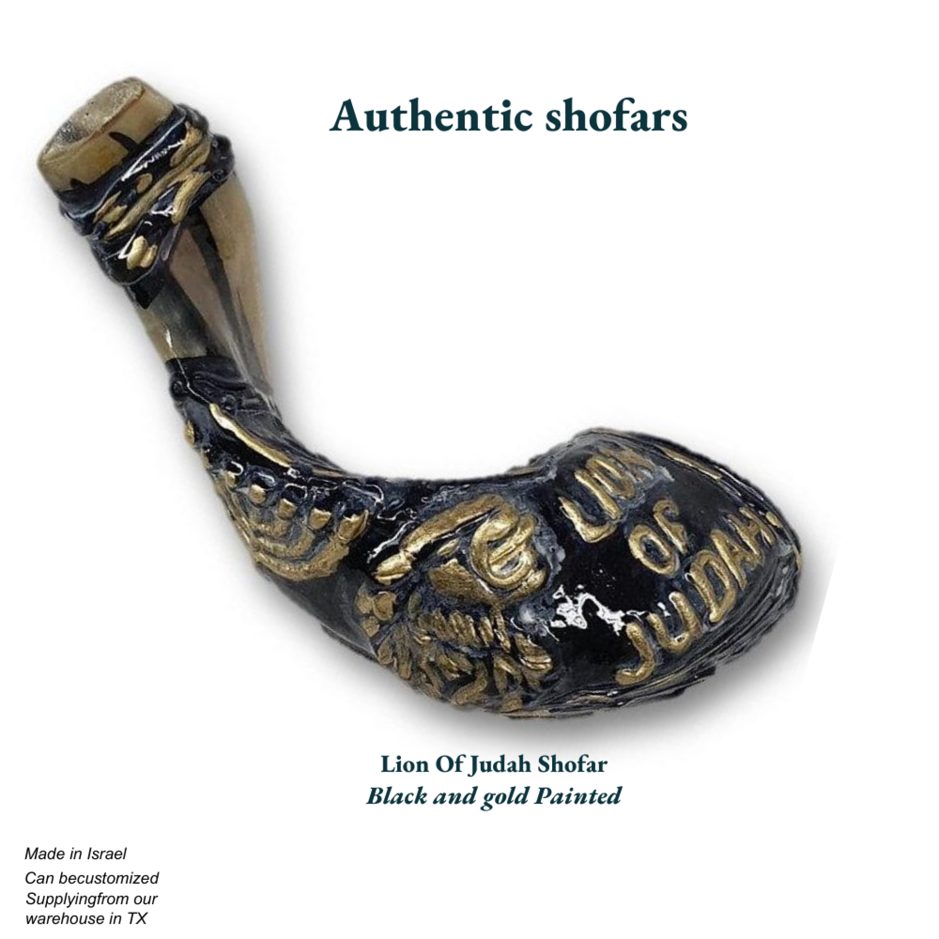 This Authentic Lion of Judah Shofar is a powerful and artistic expression of faith, featuring a masterfully hand-painted ram's horn. The design showcases the iconic Lion of Judah and a Seven-Branched Menorah, both beautifully rendered in shimmering gold against a premium black background.