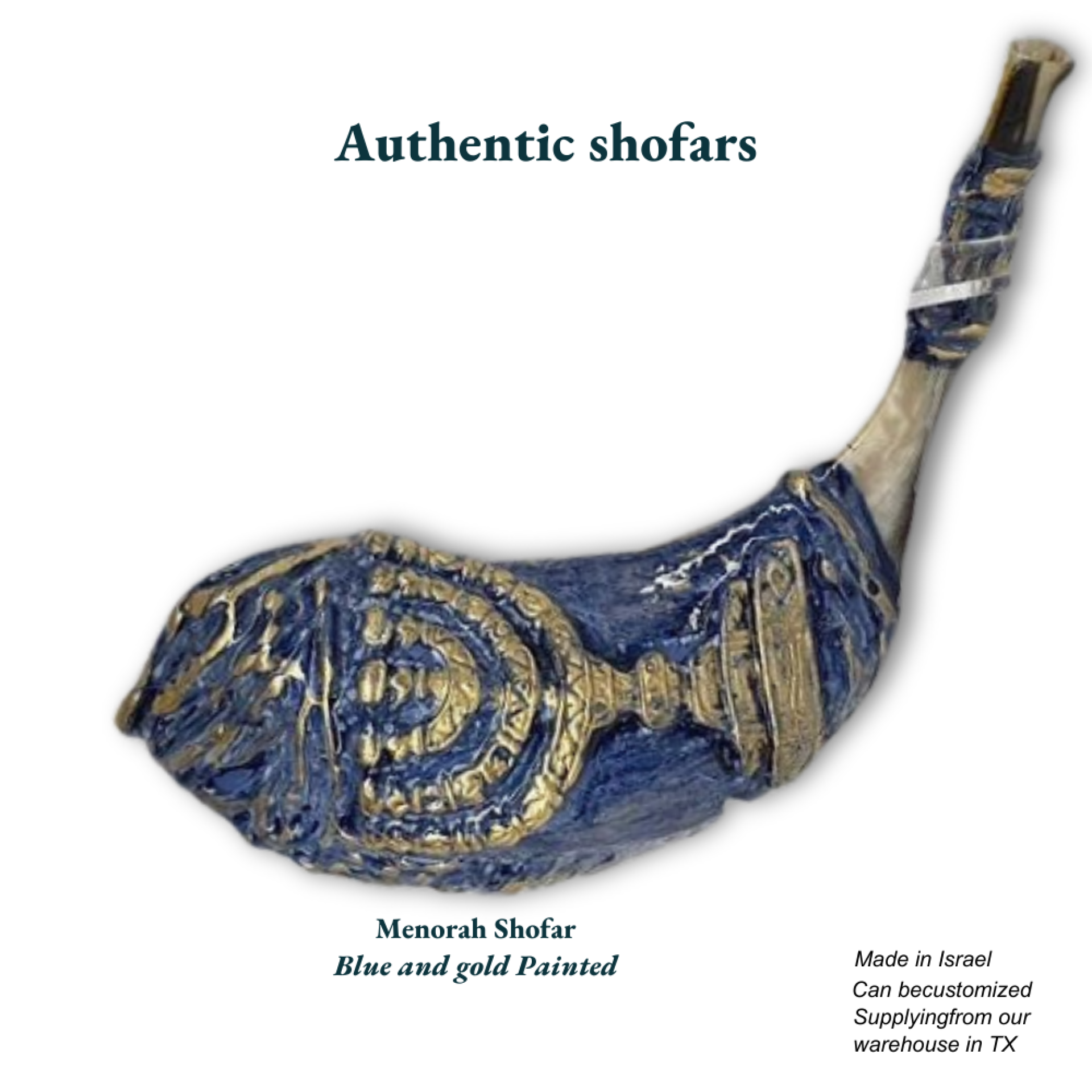 This Authentic Menorah Shofar is a stunning work of art, featuring a hand-painted ram's horn decorated in a vibrant Blue and Gold theme. The design highlights the sacred Menorah, meticulously painted in gold to contrast beautifully against the textured blue background.