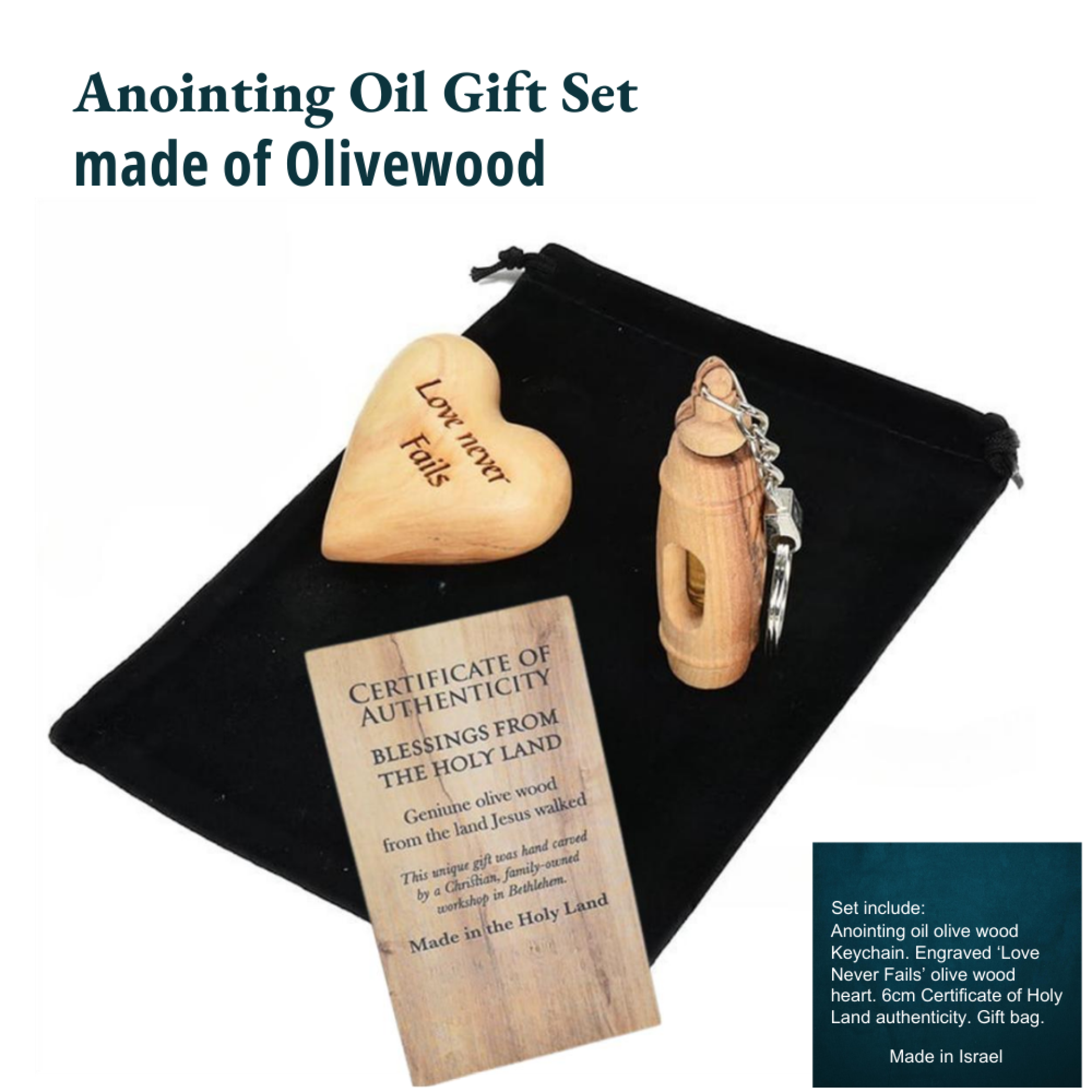 The set includes an olive wood anointing oil holder, a heart-shaped olive wood keychain engraved with “Love Never Fails,” a Certificate of Authenticity from the Holy Land, and a gift bag for elegant presentation. The rich natural grain of the olive wood makes every piece unique.