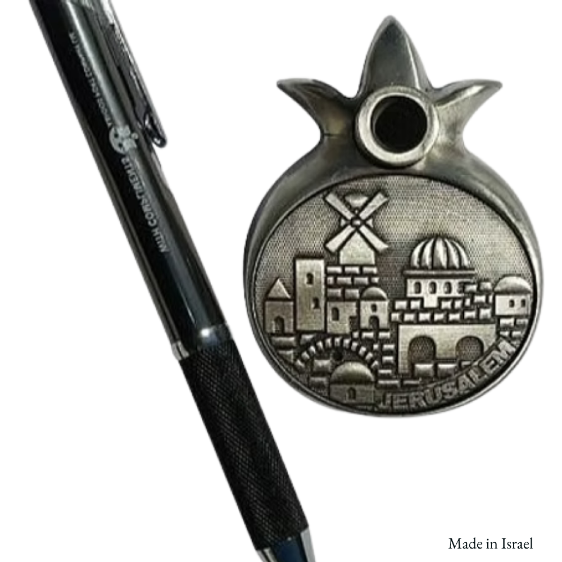 Elevate your workspace with this exquisitely handcrafted Pomegranate-Shaped Pen Holder. Shaped like the traditional biblical fruit of abundance, this functional piece of art is decorated with a detailed relief of the Old Jerusalem cityscape, bringing a touch of the Holy Land to your desk. Cast in high-quality metal with a sophisticated antique silver finish, it serves as both a practical stationary organizer and a beautiful symbolic ornament.
