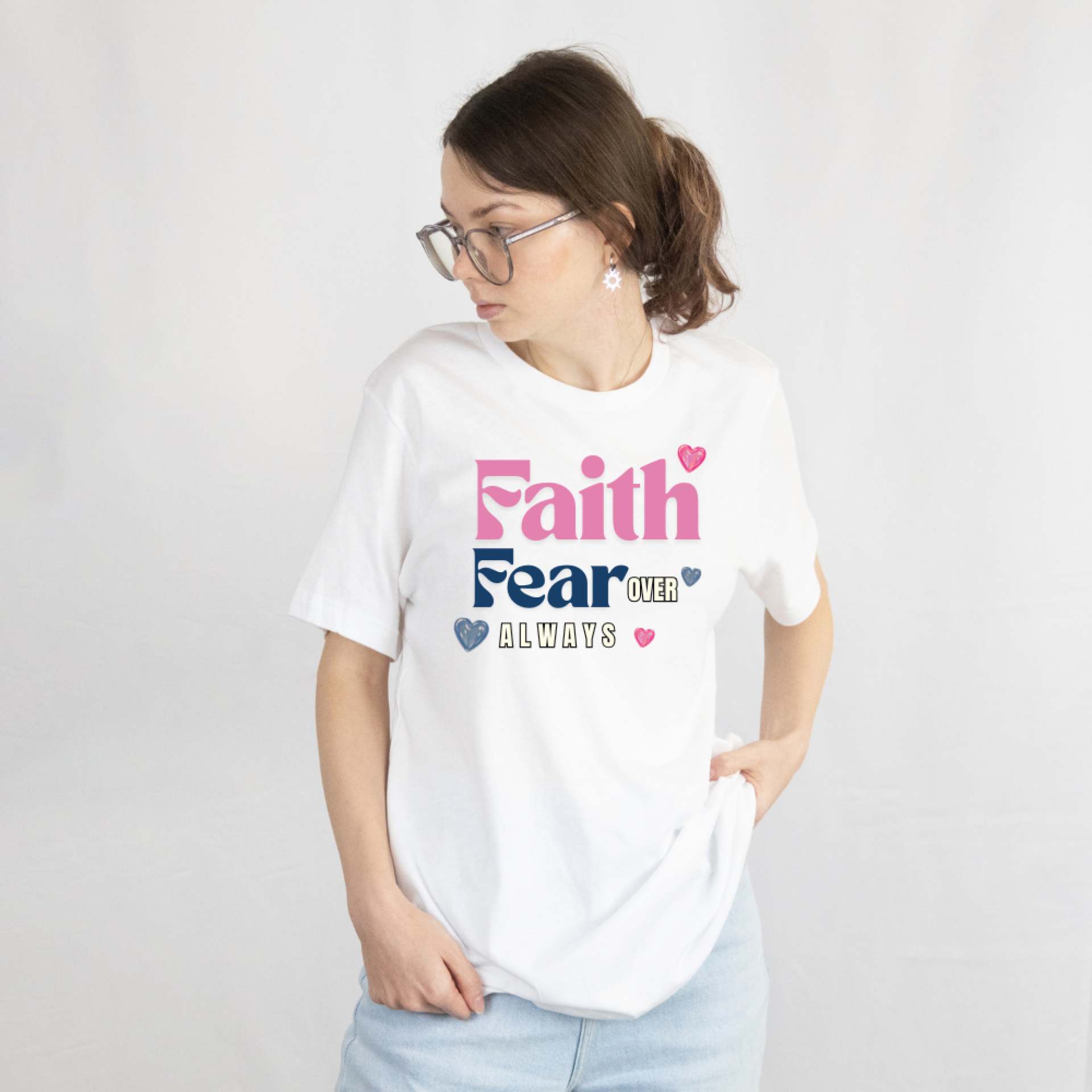 Express your faith in style with this “Faith Over Fear Always” Christian T-Shirt for Women. This inspirational graphic tee carries a powerful message of courage and belief, reminding you to choose faith over fear in every moment. The elegant typography with cute heart graphics creates a meaningful and stylish design that perfectly blends faith with modern fashion.