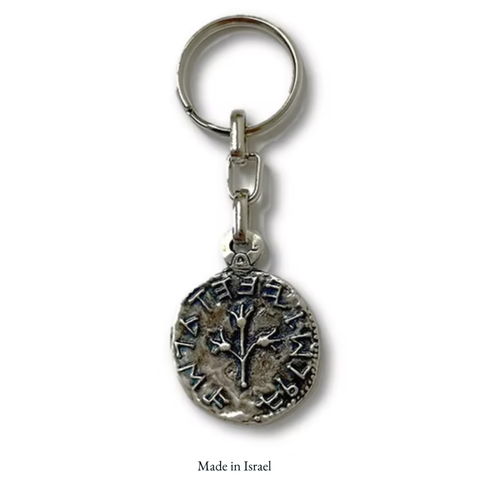 This beautifully handcrafted coin keychain is a replica of the ancient "half a shekel" coin from the great revolt of the Jews in 66-70 CE that was found at the temple in Jerusalem. The Keychain is made of cast metal with an antique silver finish. Made in the Holy land by Jewish immigrants.