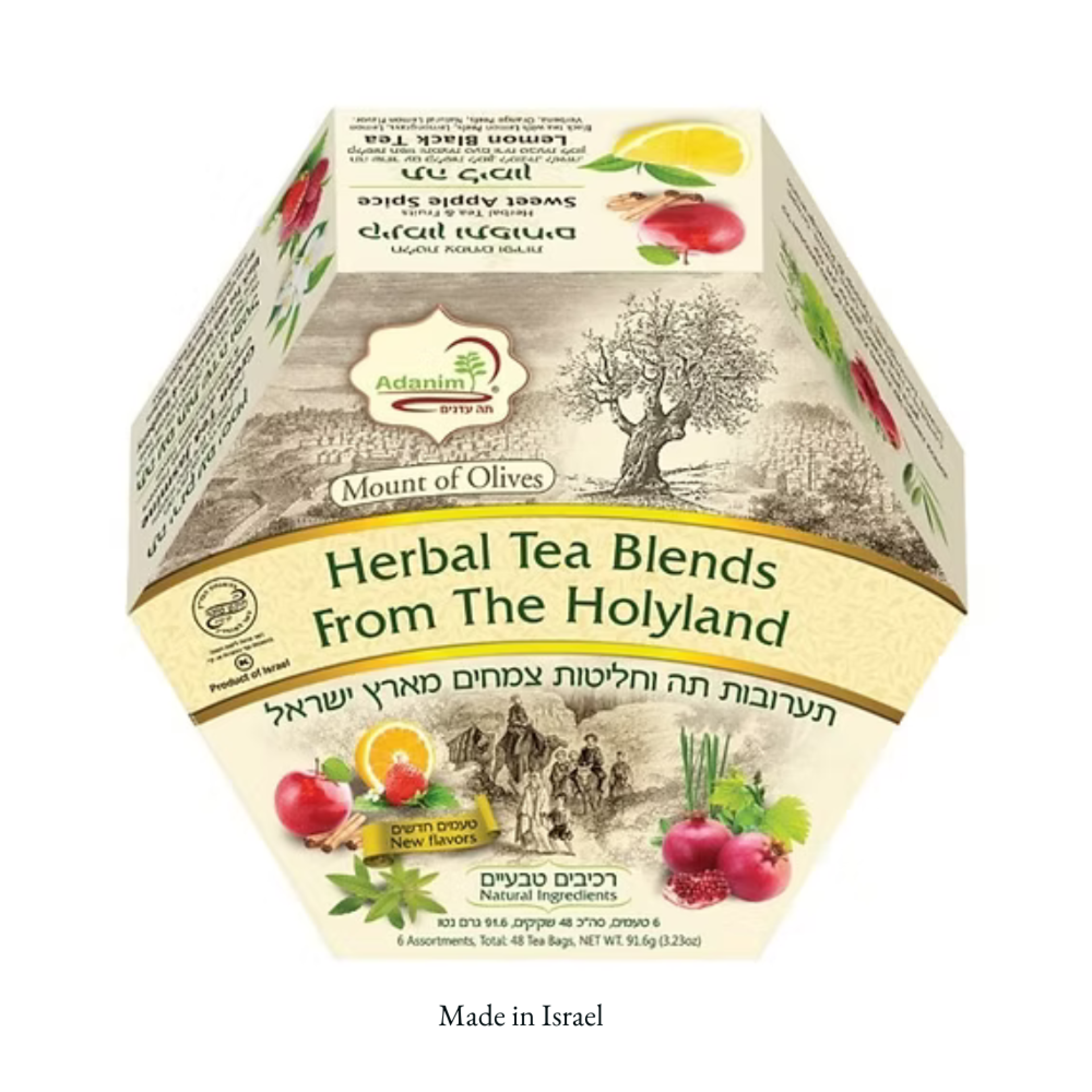 Experience the natural flavors and soothing aromas of the biblical landscape with our Herbal Tea Blends From The Holy Land. This elegantly curated collection features six assorted organic tea flavors, including Lemon Black Tea and Sweet Apple Spice, meticulously selected to reflect the botanical heritage of the region.
