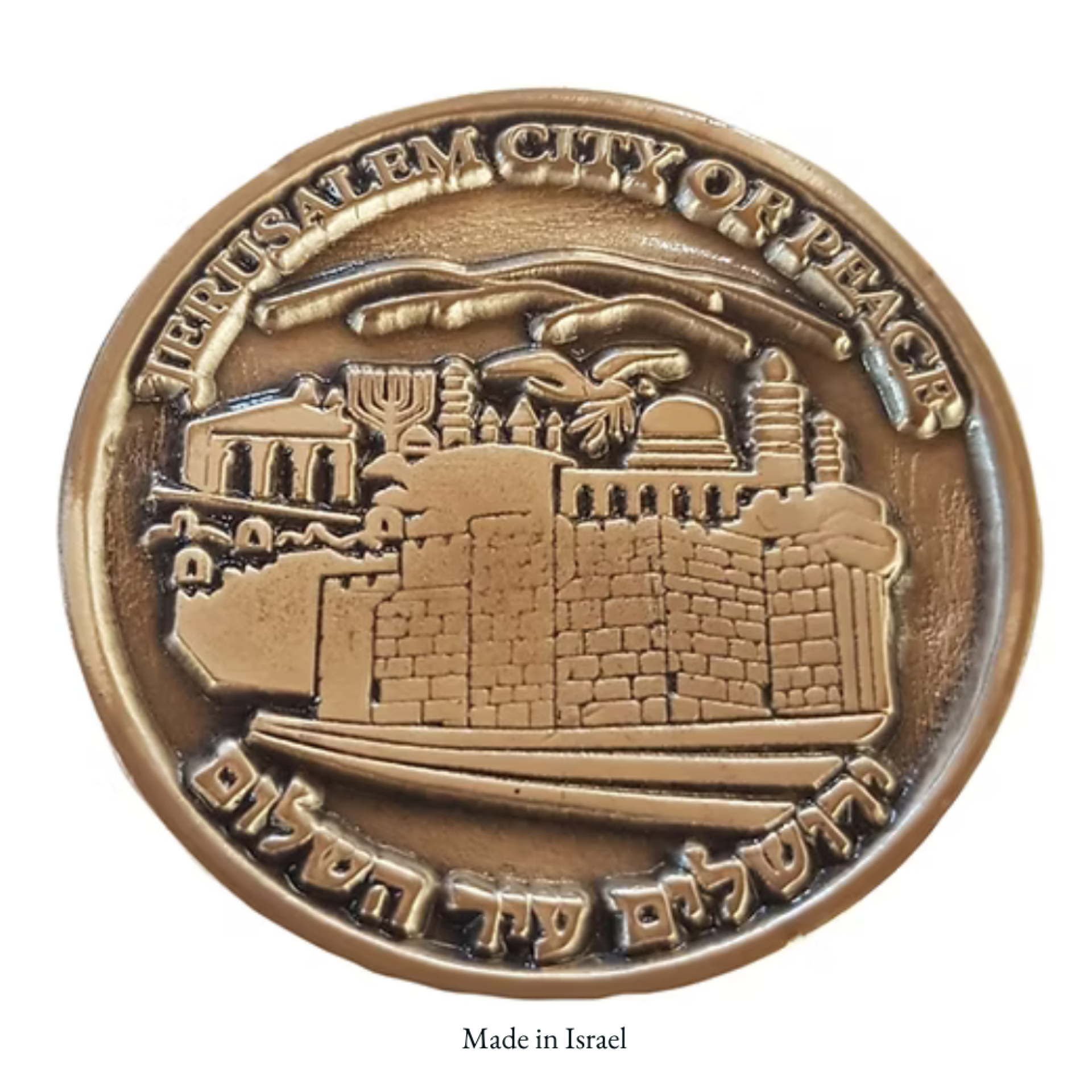 Bilingual Inscriptions – Features the "City of Peace" message in both English and traditional Hebrew script.