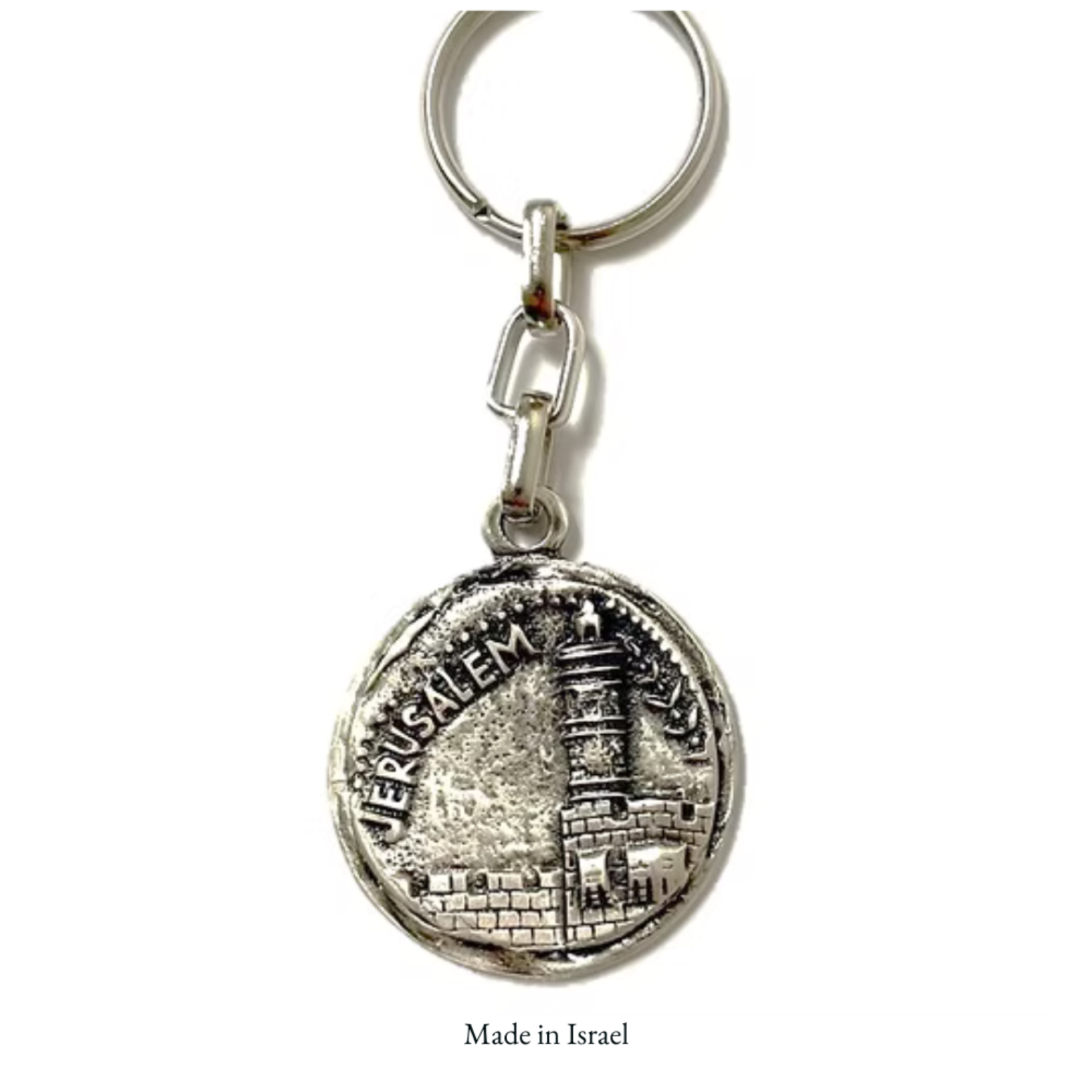 Made from durable cast metal with an antique silver finish, this keychain is both stylish and meaningful. It is made in the Holy Land by Jewish immigrants, making it a special keepsake, souvenir, or thoughtful gift for anyone who loves Jerusalem and its spiritual heritage.