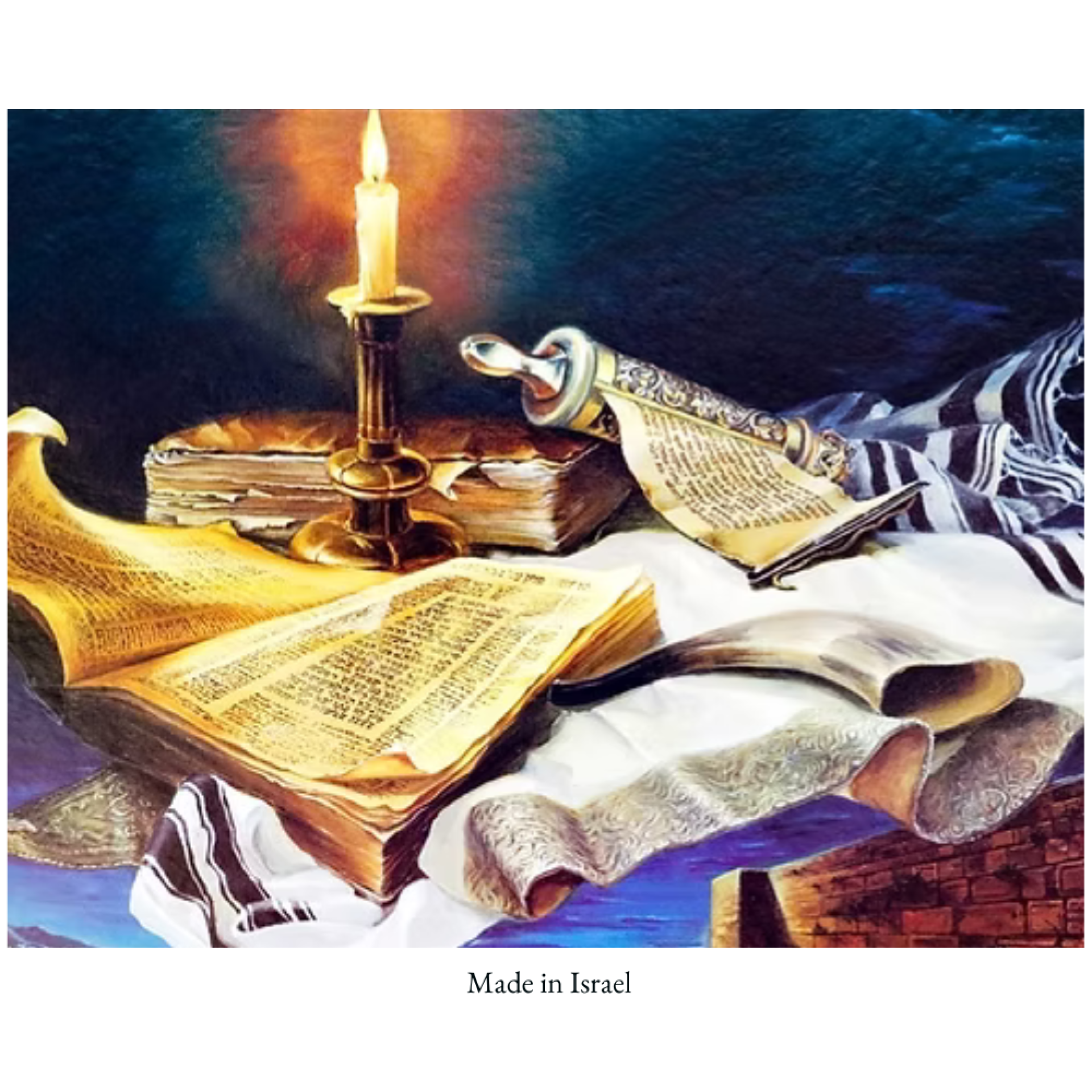 Features sacred symbols: Torah scrolls, Shabbat candle holders, and the Tallit (prayer shawl)