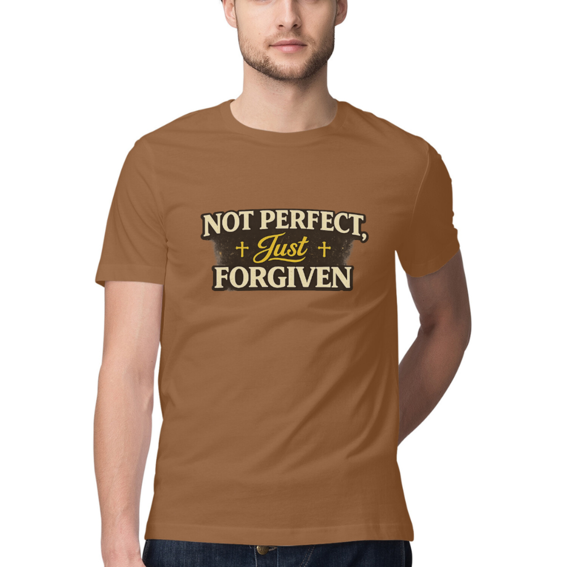 Wear your faith with humility and confidence in this “Not Perfect, Just Forgiven” Christian Regular Fit Front Print UNISEX T-Shirt for Men & Women. Featuring a bold typography design with highlighted script and cross accents, this T-shirt shares a powerful message of grace and forgiveness.