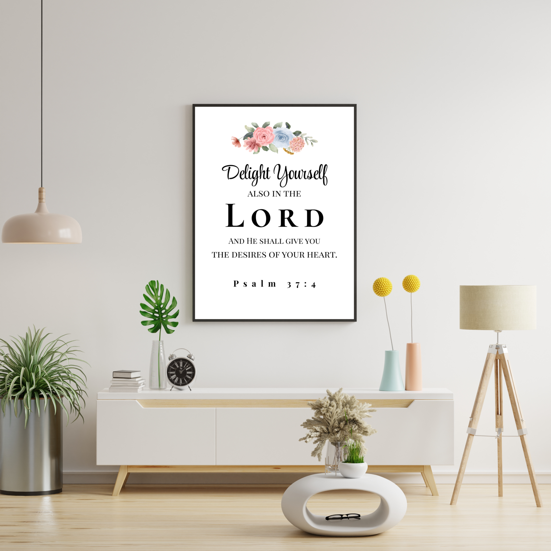 Bring faith, hope, and inspiration into your home with this beautifully designed Psalm 37:4 Bible Verse Wall Frame. Featuring the uplifting scripture “Delight Yourself in the Lord and He Shall Give You the Desires of Your Heart”, this Christian wall art adds a peaceful and spiritual touch to any space.