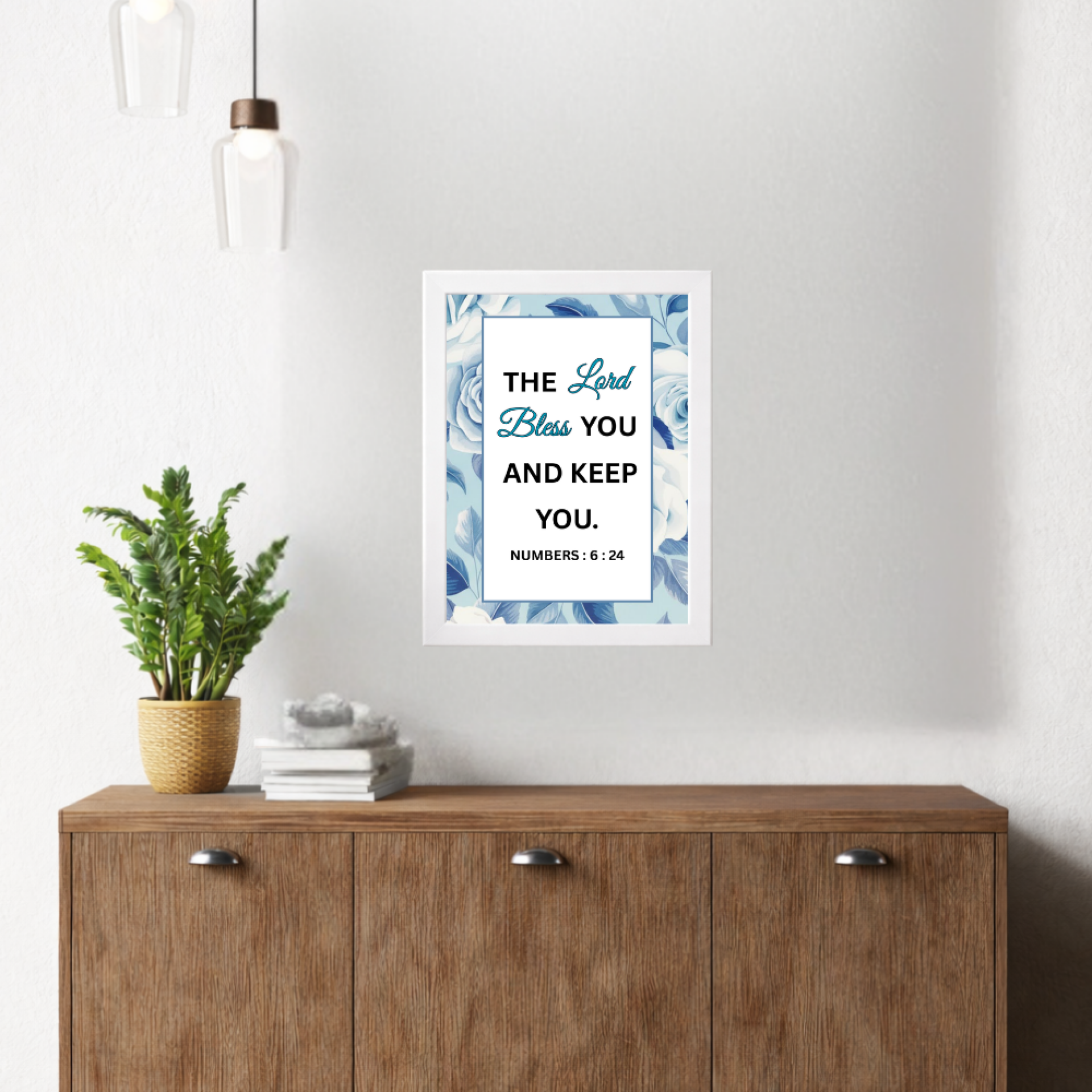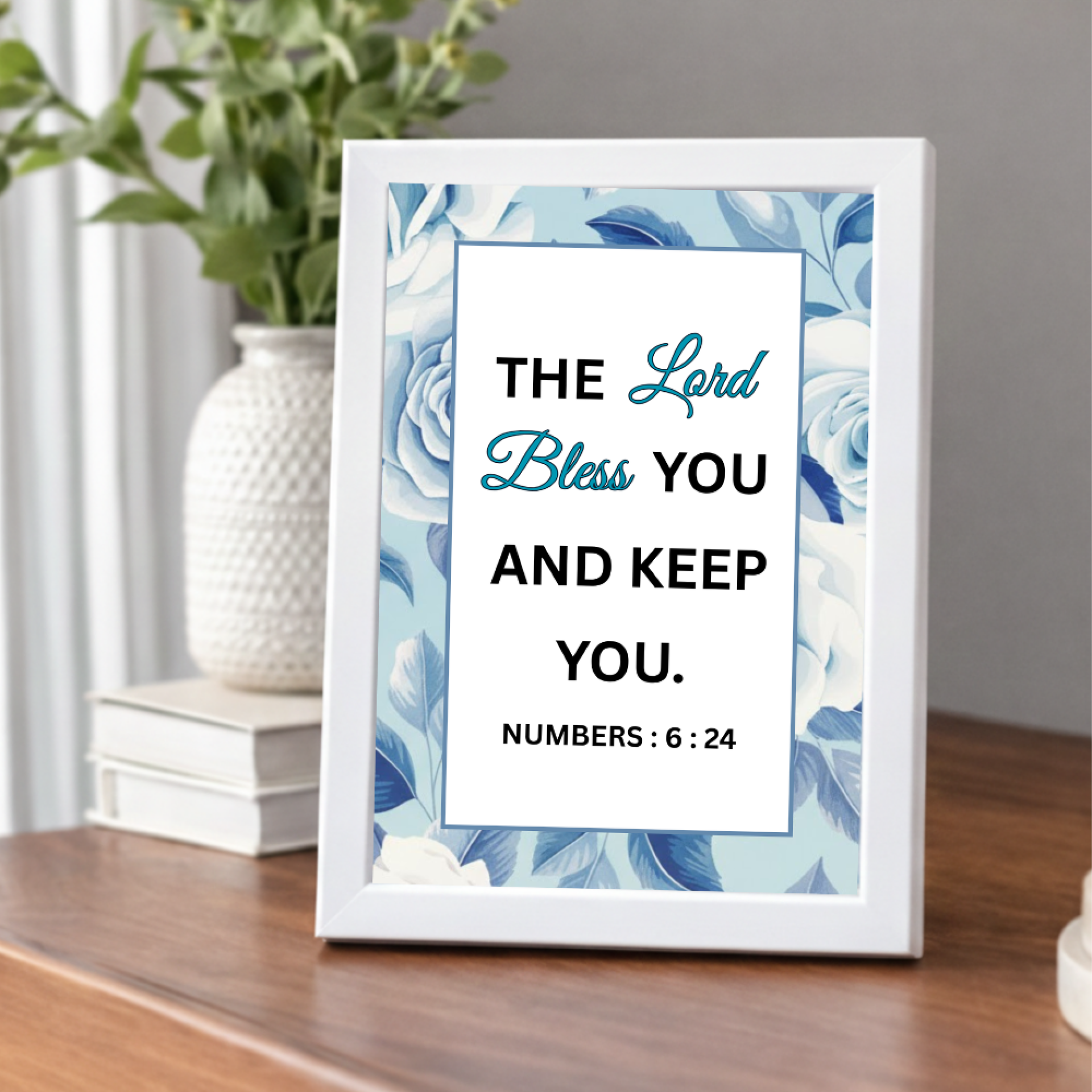 Add a peaceful and spiritual touch to your home with this beautiful “The Lord Bless You and Keep You” Bible verse wall frame (Numbers 6:24). Designed with soft blue floral artwork and elegant typography, this Christian scripture wall art is perfect for living rooms, bedrooms, offices, prayer rooms, and churches.