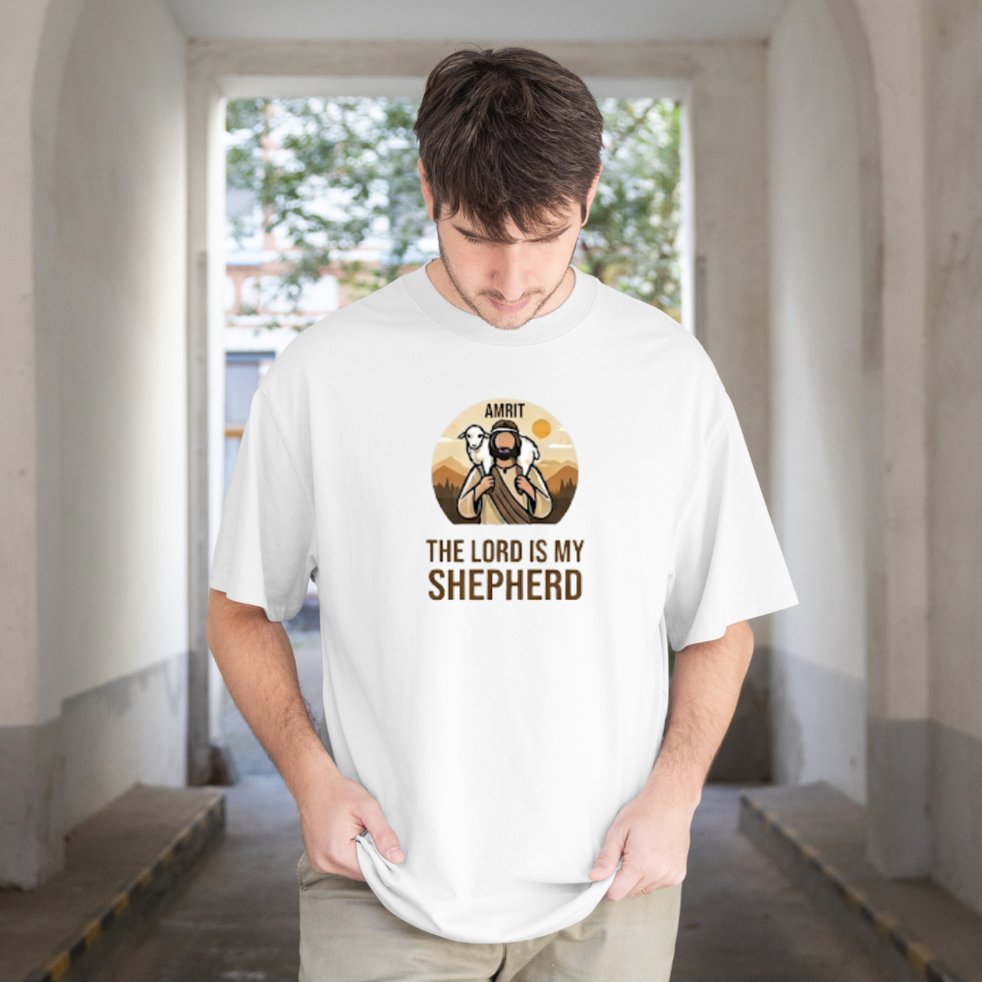 Show your trust in God with this beautifully designed “The Lord Is My Shepherd” Christian Oversized Front Print UNISEX T-Shirt for Men & Women. Inspired by Psalm 23, this design features a warm and artistic illustration of a shepherd carrying a sheep, symbolizing care, protection, and divine guidance.