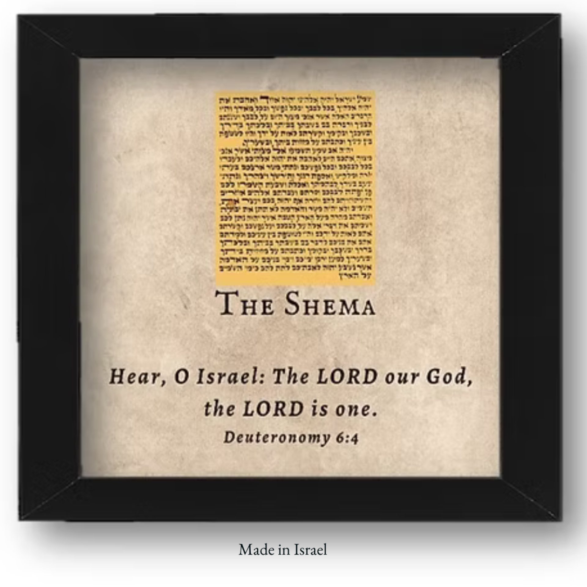 This elegantly printed replica of the SHEMA prayer, the most powerful prayer of the Jewish people, would be a great addition to your home or office decor. Displayed in a black frame with a glass front the scroll fragment is above the scripture from Deuteronomy 6 verses 4-9, displayed in English. Made in the Holy Land by Jewish immigrants.